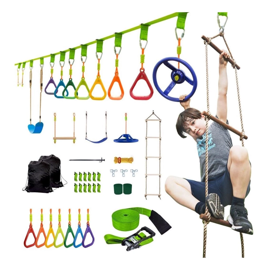 • Innehåll i förpackningen: 1 st slackline, 1 st spänne, 14 st remmar med spänne, 14 st trekantiga karbiner, 2 st trädskydd, 1 st gunga, 7 st gymnastikringar, 1 st plastigt ratt, 1 st räcke, 1 st stege, 1 sats lim, 2 st förvaringsväskor, 1 st plugg (används tillsammans med rep för att fästa klätterstegen i marken), 1 st rep.