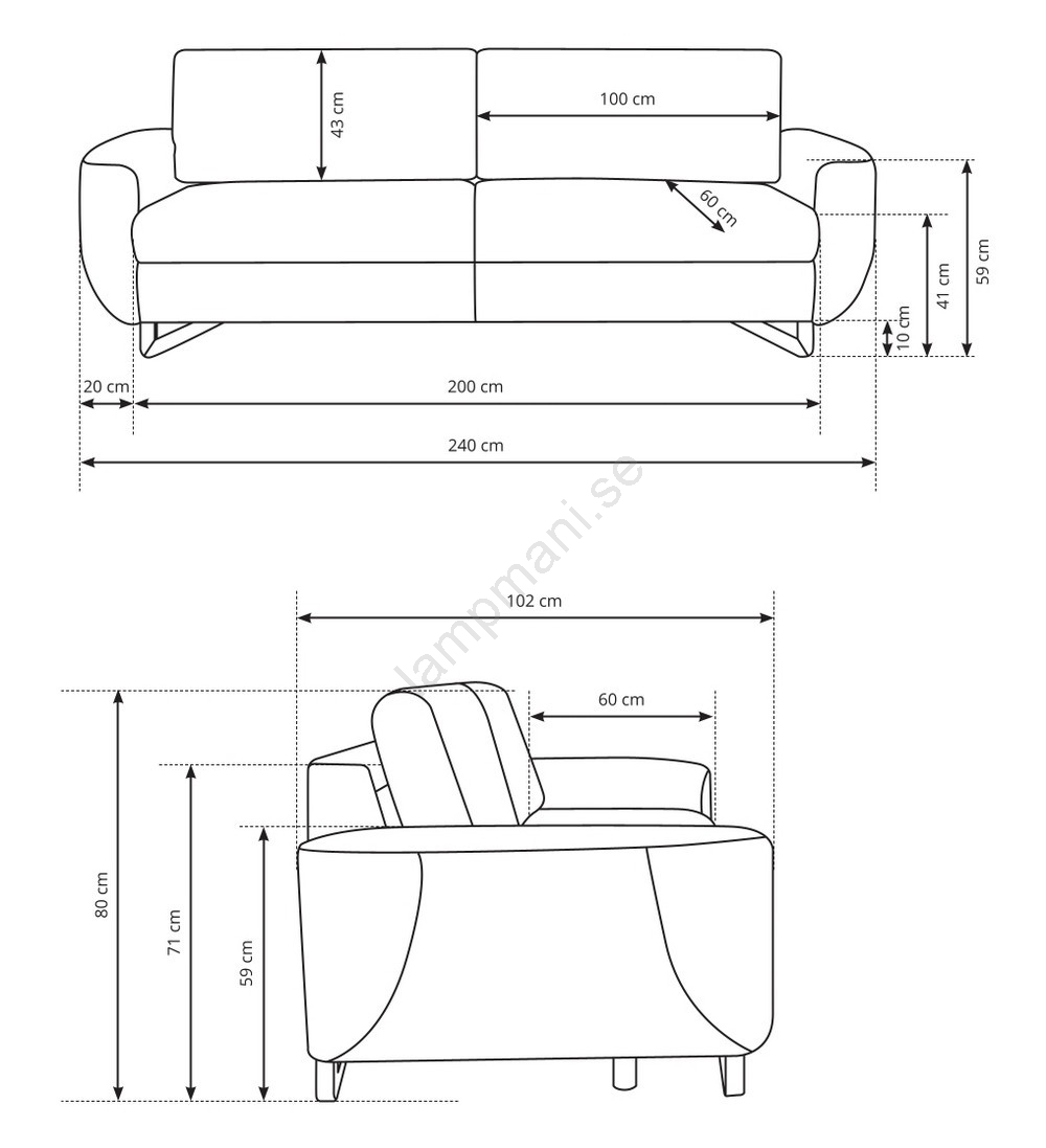 • Sittdjup 60 cm ger gott om plats för avslappnat och ergonomiskt sittande.