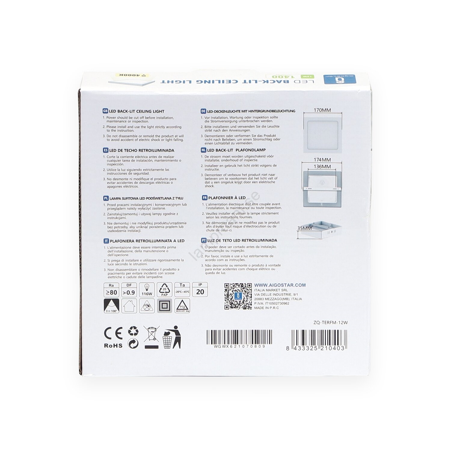 Aigostar - LED Fäst taklampa LED/12W/230V 17,3x17,3 cm 4000K vit | Lampmani