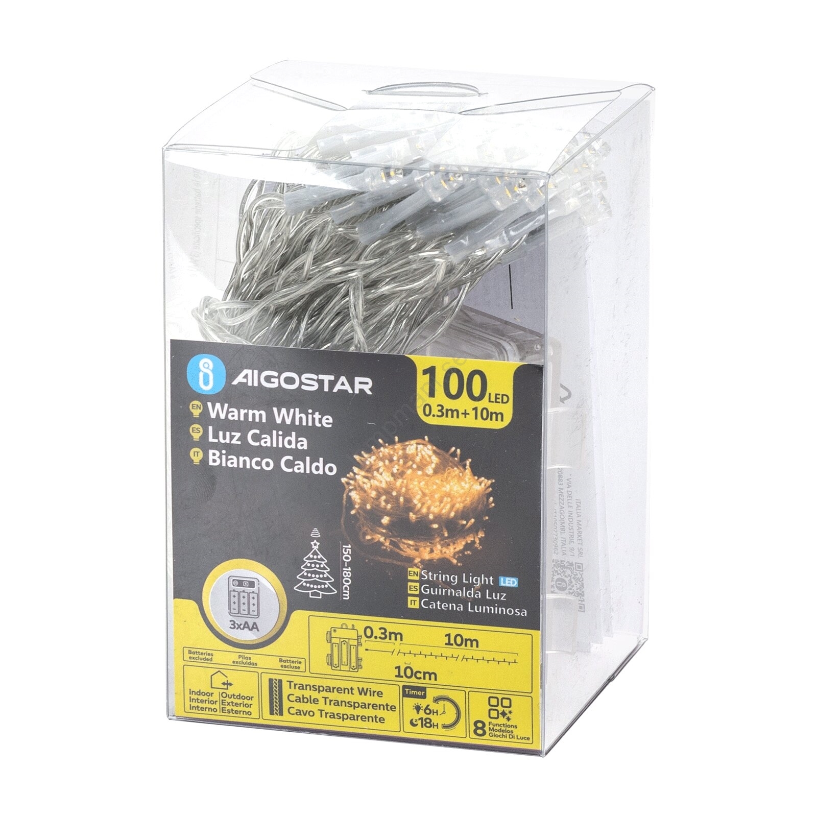 Aigostar - LED Utomhus julbelysning 100xLED/8 funktioner 3xAA 10,3m IP44 varmvit