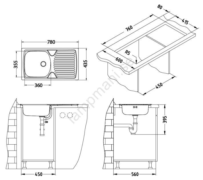 • Paketets innehåll: rostfri diskho, fästen och packningar, bottenventil 1 1/2", vattenlås med avledning till diskmaskin, propp, köksblandare, anslutningsslangar, monteringskit.