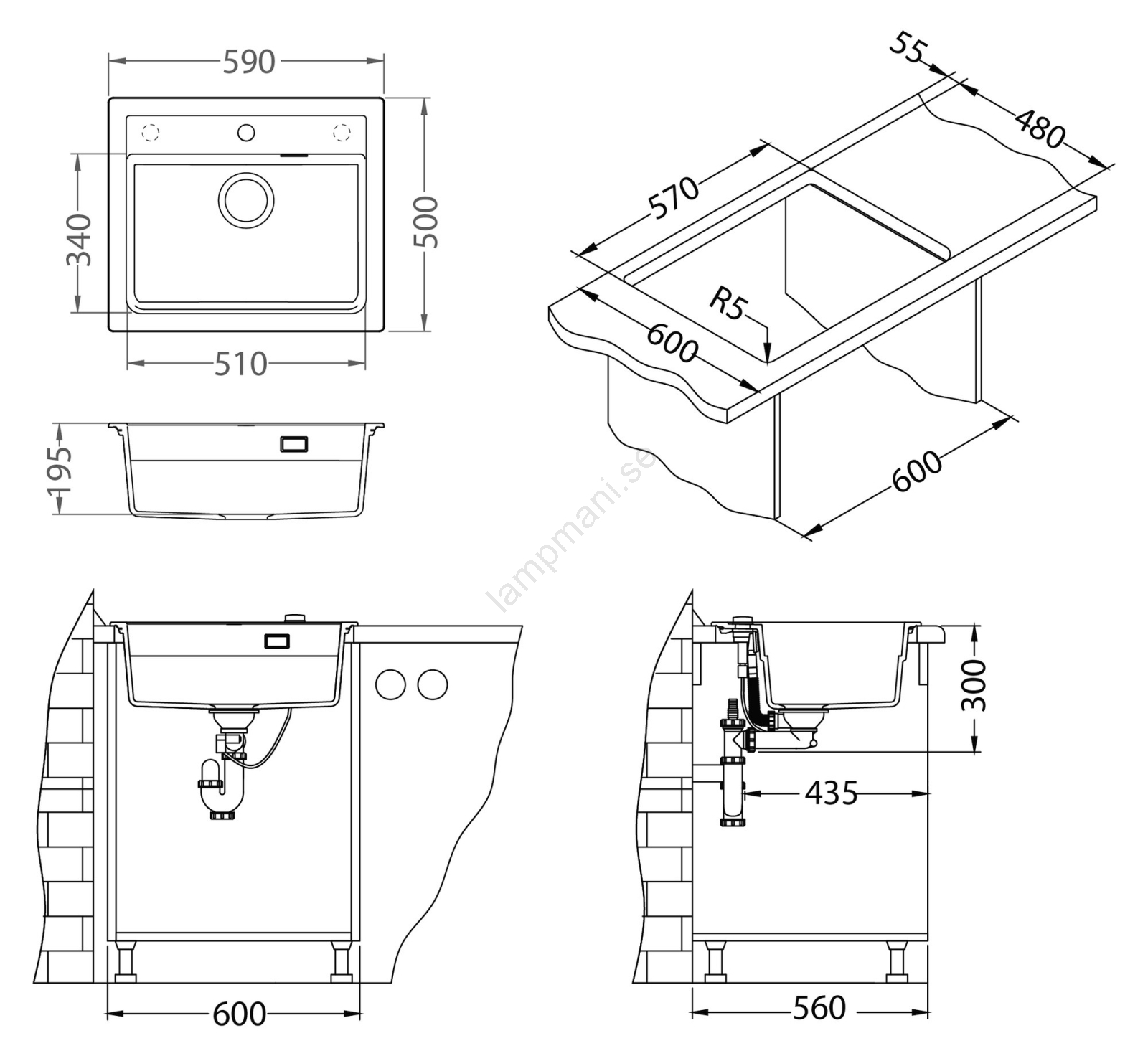 • Innehåll i förpackningen: granitdiskho, fästen, silventil 3 1/2, siphon med avgrening för diskmaskin, köksblandare, anslutningsslangar, monteringspaket.