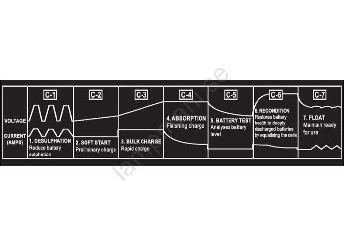 • C-1 Desulfatering: Laddning med pulserande ström. Denna fas startar automatiskt om batterispänningen är under 11V och föregår den normala laddningscykeln.