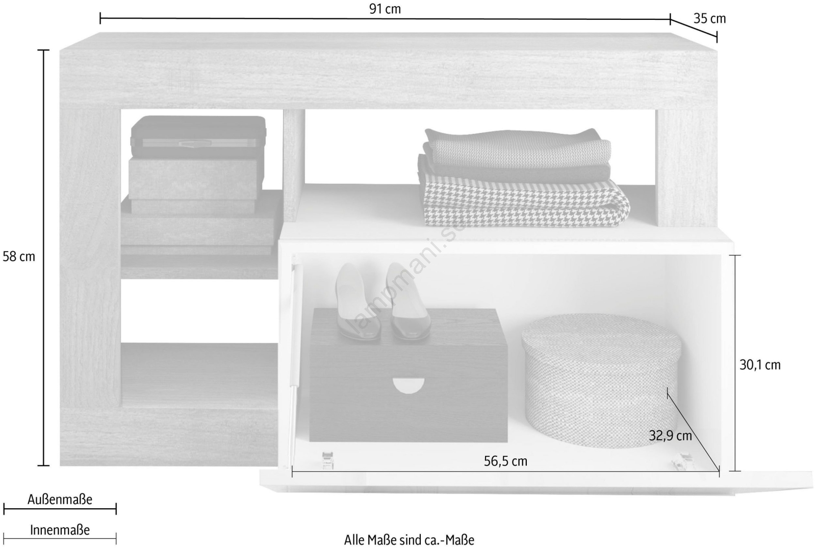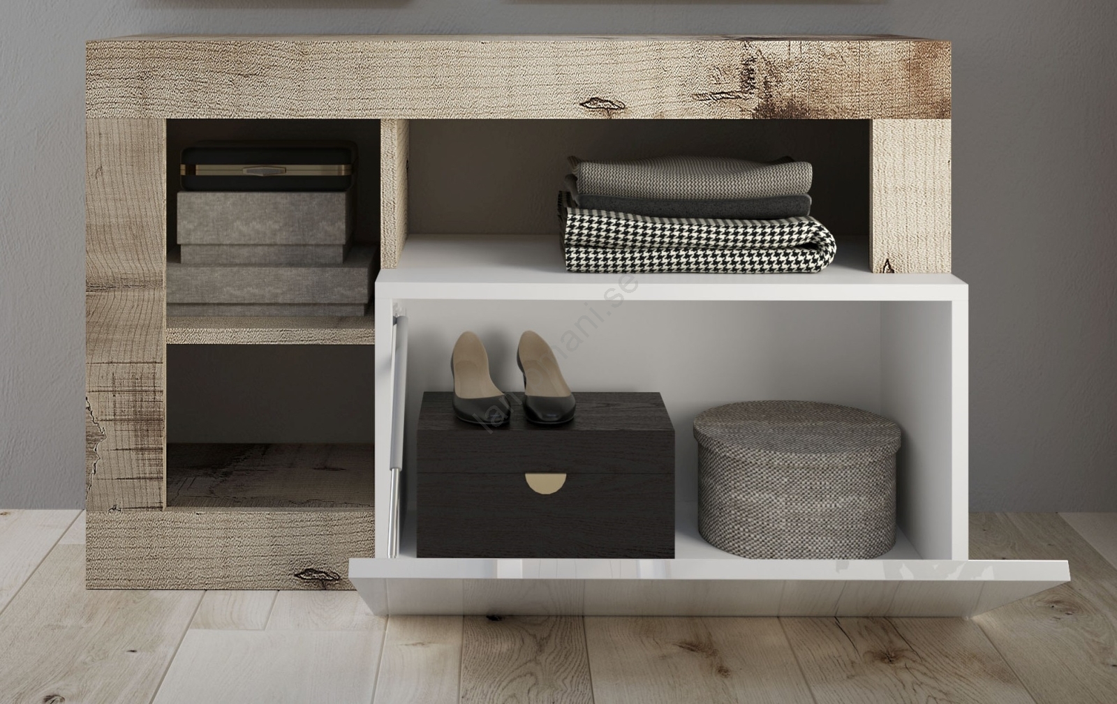 • Utrustad med 3 öppna hyllor och en inre hylla med uppfällbar lucka för förvaring av väskor, skor och säsongsartiklar.