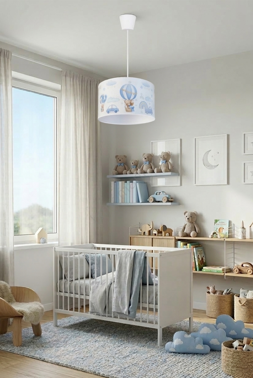 Brilagi - LED barnpendel på kabel BOBO 1xE27/10W/230V Ø 35 cm blå med nallemotiv kännetecknar snygg och funktionell design. En glödlampa med E27 lock är lämplig för lampan. Här kan du köpa andra glödlampor till förmånliga priser. Du kommer att få ett intressant tillägg till ditt hem.