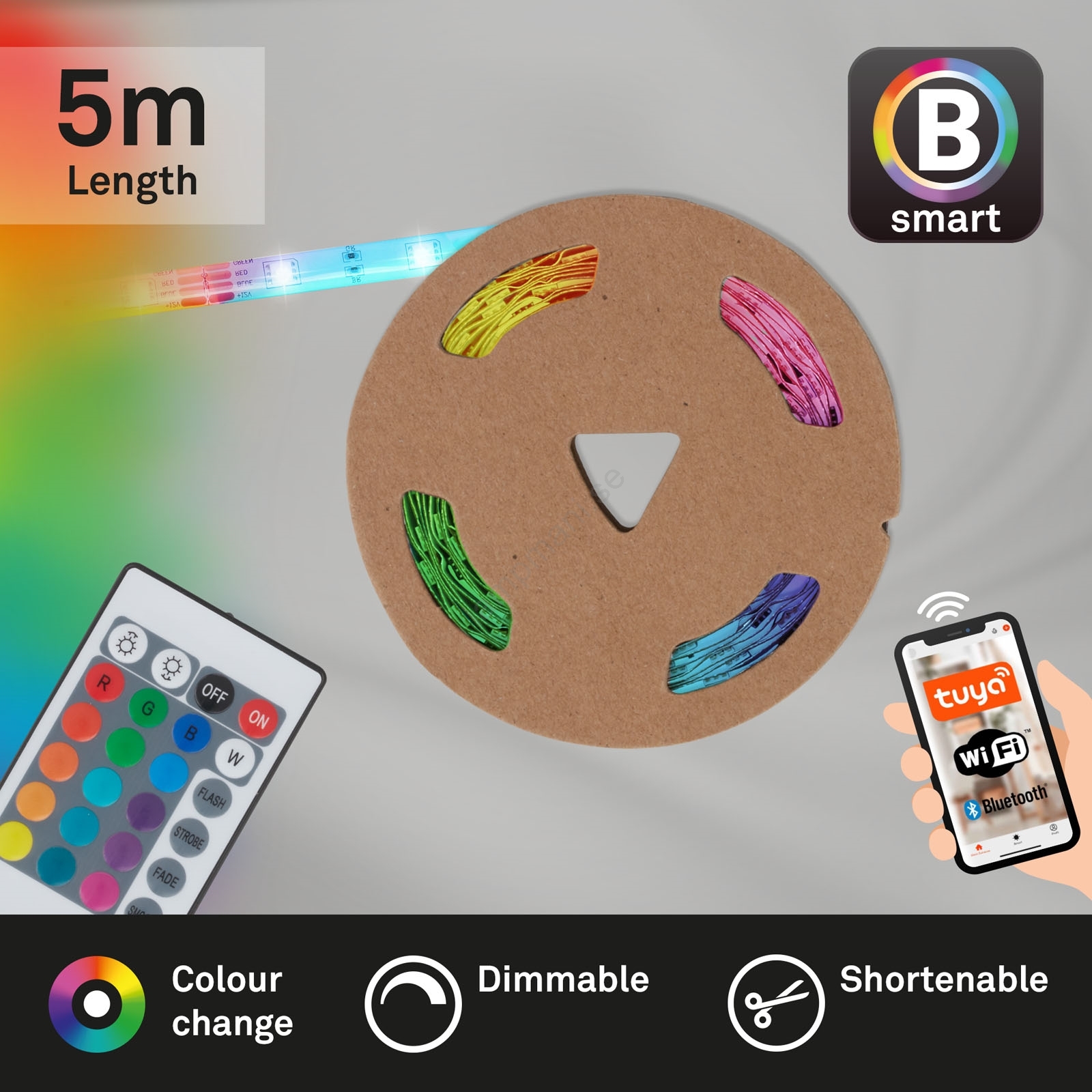 • Remsan kan styras via Tuya Smart-appen (kompatibel med både iOS och Android) via Wi-Fi.