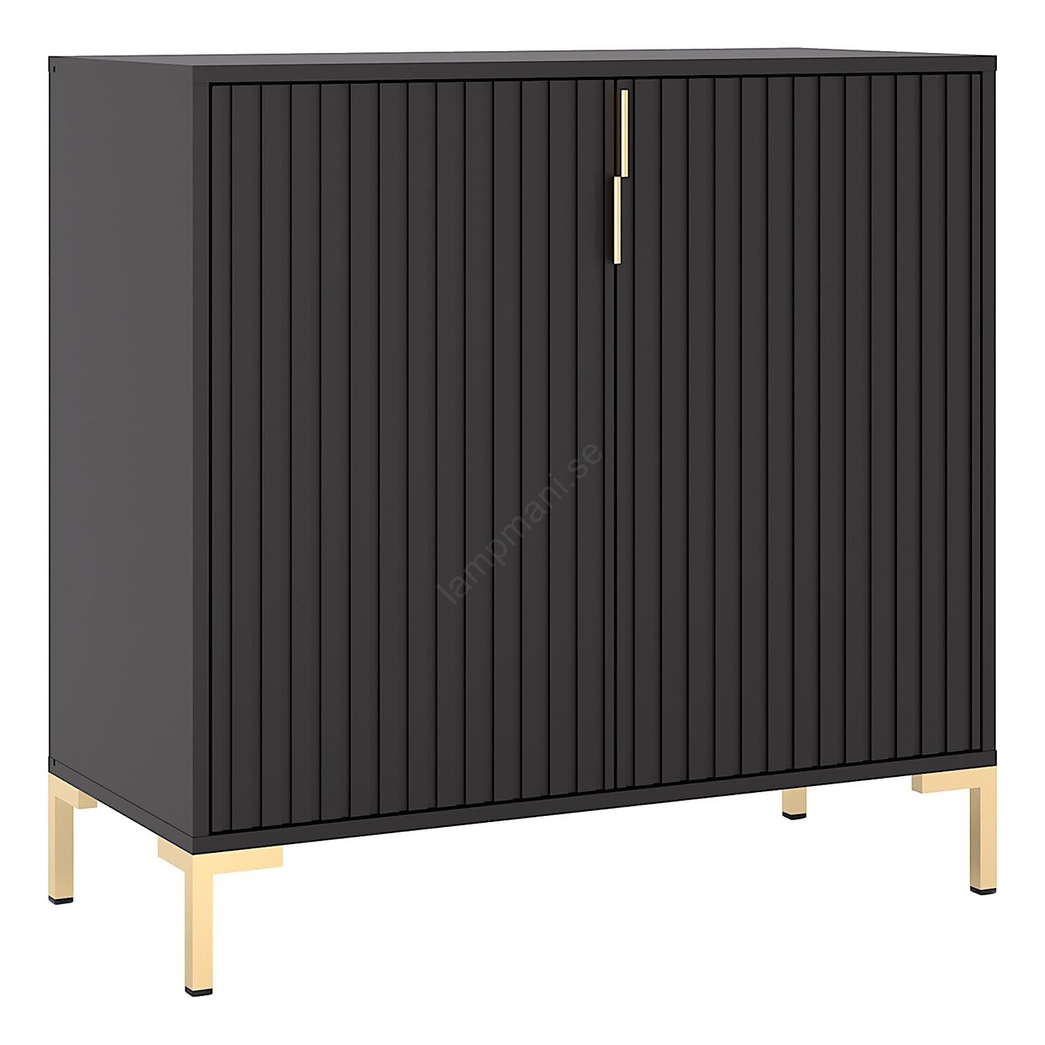 • Den har fyra hyllplan och två dörrar med vertikal ribbning.