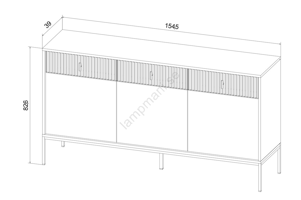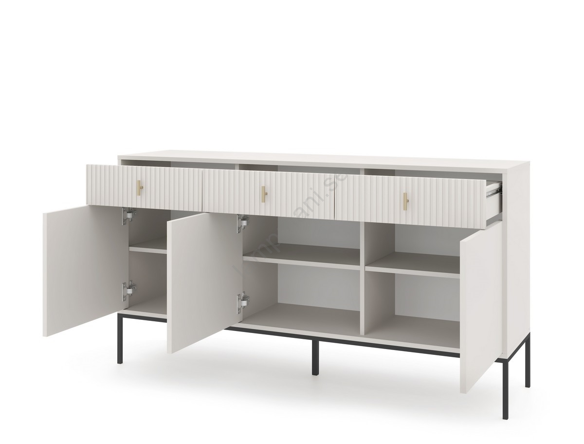 • Den har tre nedre dörrar med gott om förvaringsutrymme och tre lådor med handtag och vertikal ribbad yta.