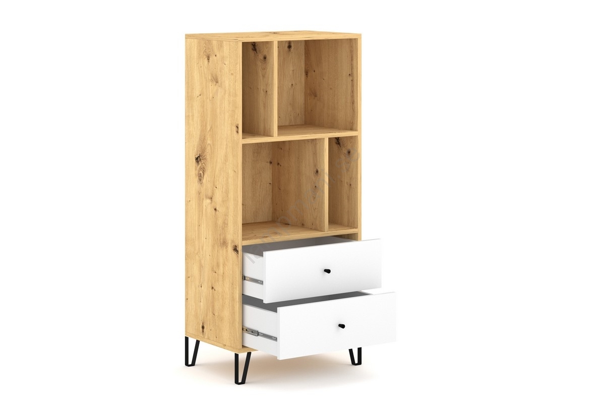 • Den har fyra öppna hyllor och två lådor för överskådlig förvaring.
