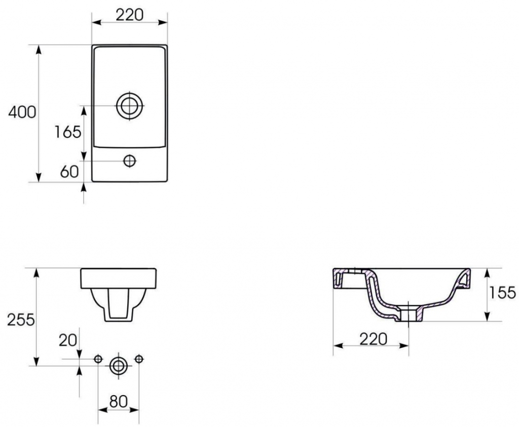 • Modernt och elegant handfat med bräddavlopp och hål för blandare.