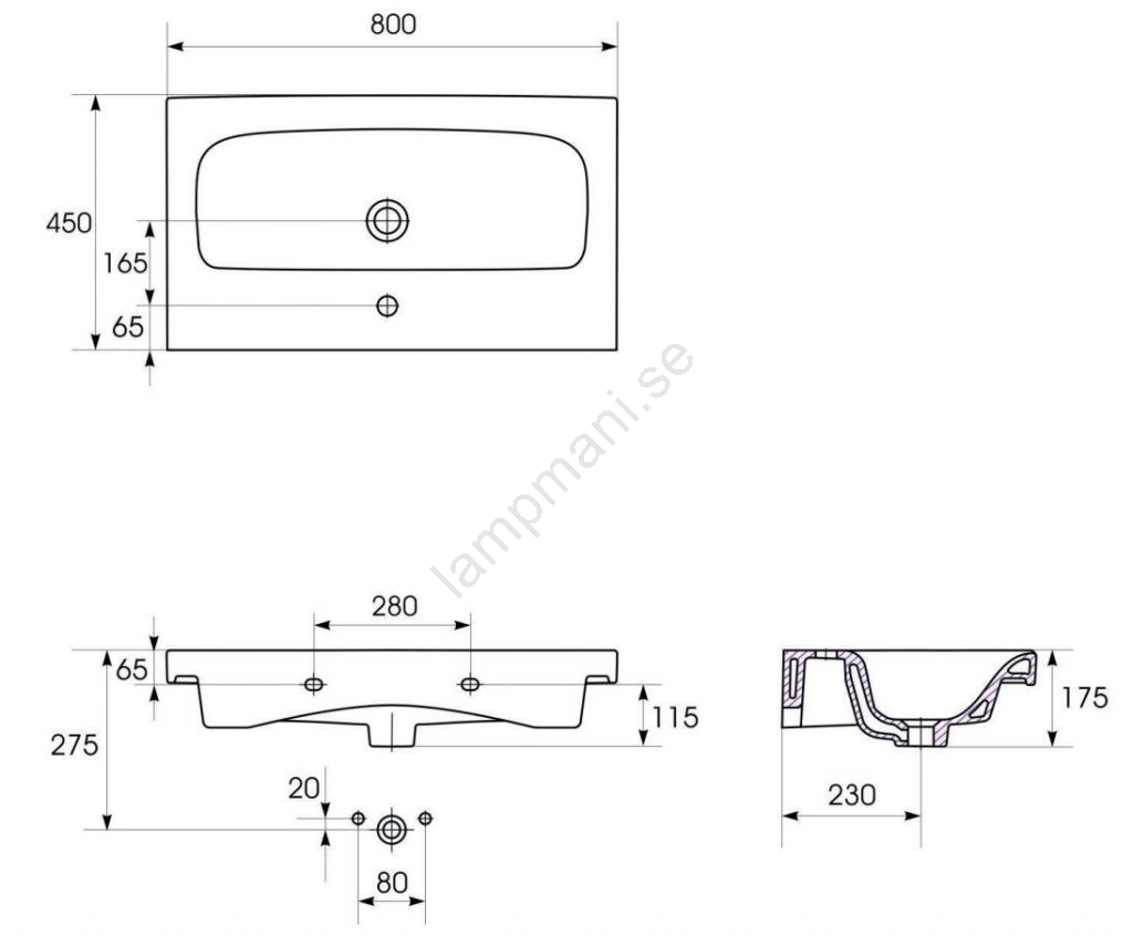 • Det keramiska tvättstället har en klassisk rektangulär form med hål för blandare och överfyllnadsskydd.