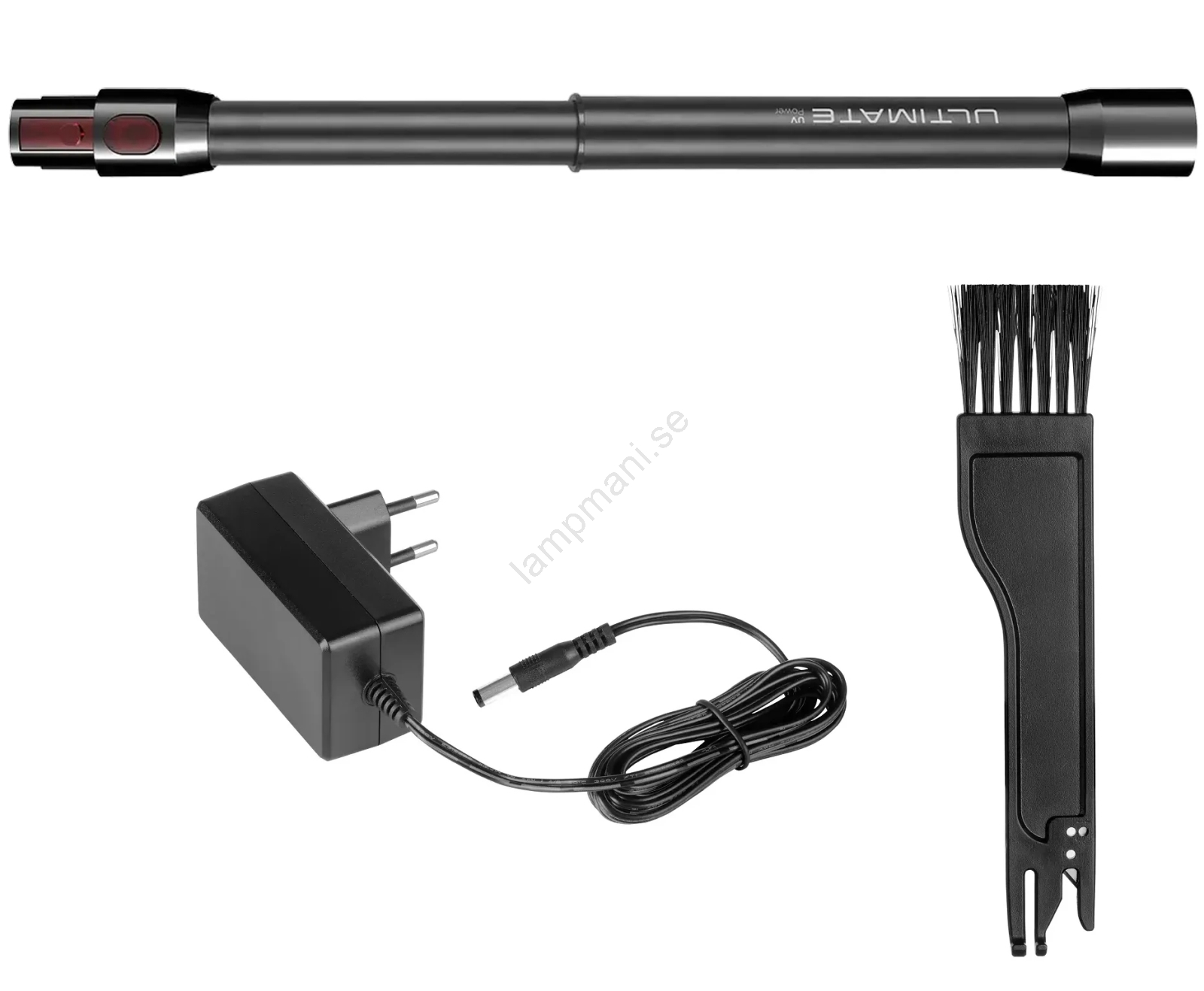 • Tillbehör i förpackningen: Flexibel böjbar förlängningsdel i dammsugarens överdel, liten UVC-turboborste, HardFloor-borste, Carpet-borste, flexibel slang, springmunstycke, springmunstycke med borste, möbelmunstycke, nätadapter.