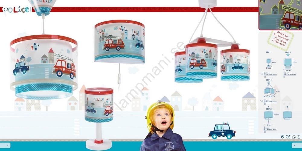 • Glatt barnlampa med charmiga motiv av polis- och brandbilar!