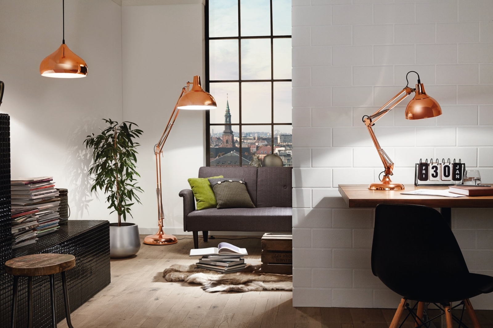 • Modern taklampa med eleganta former i blank kopparfärg.