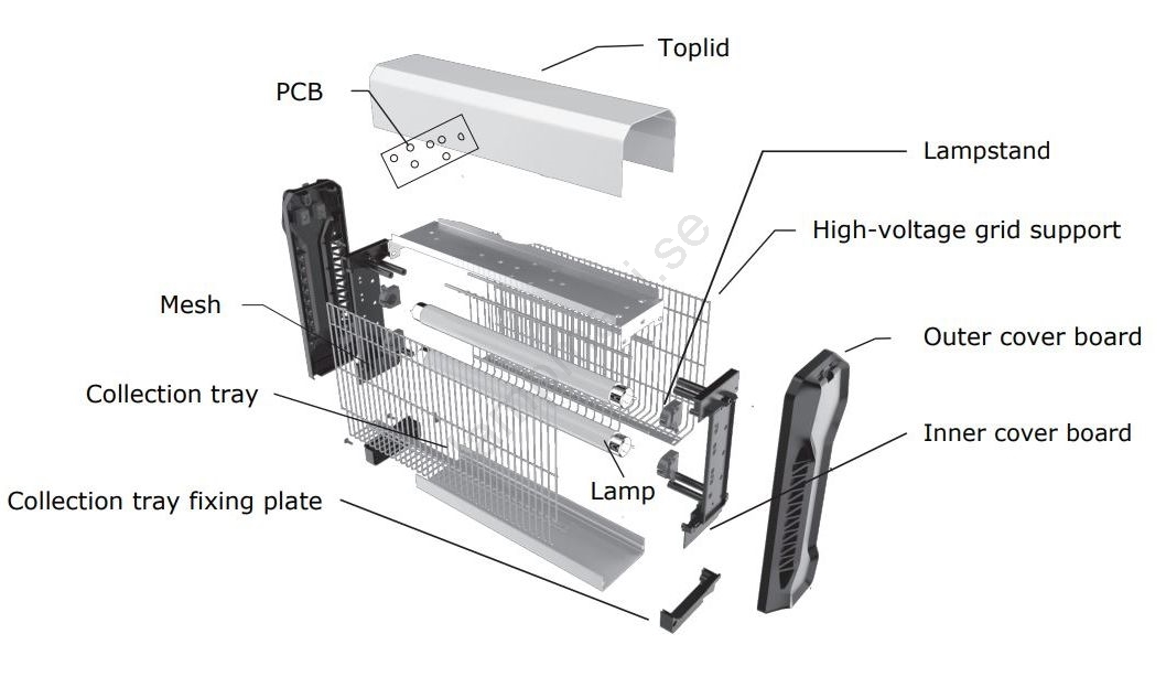 • IP20-klassning - vid utomhusbruk (balkong, terrass, pergola) rekommenderas att placera fällan på en torr plats där den inte utsätts för vatten eller hög fuktighet.
