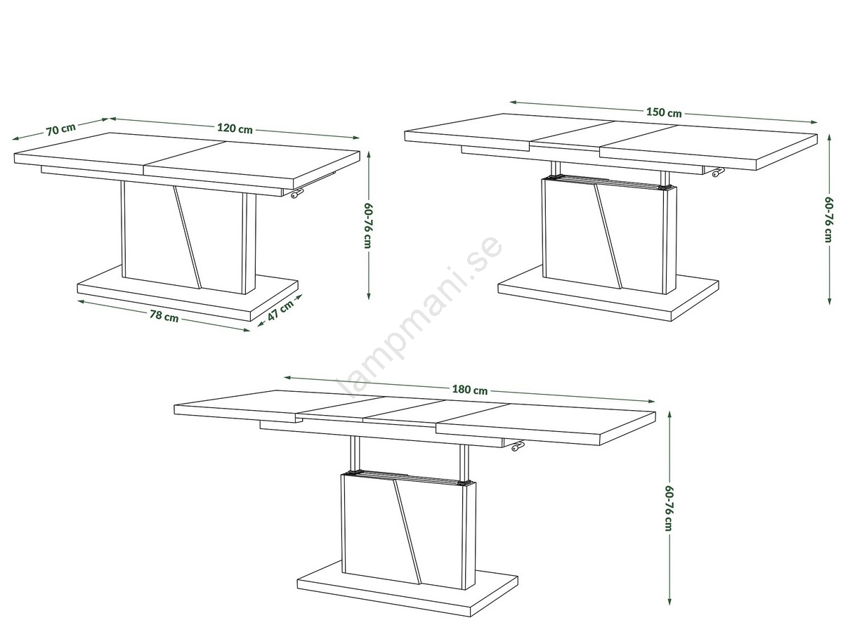 • Tack vare två 30 cm iläggsskivor kan bordsskivan förlängas till 150 eller 180 cm.