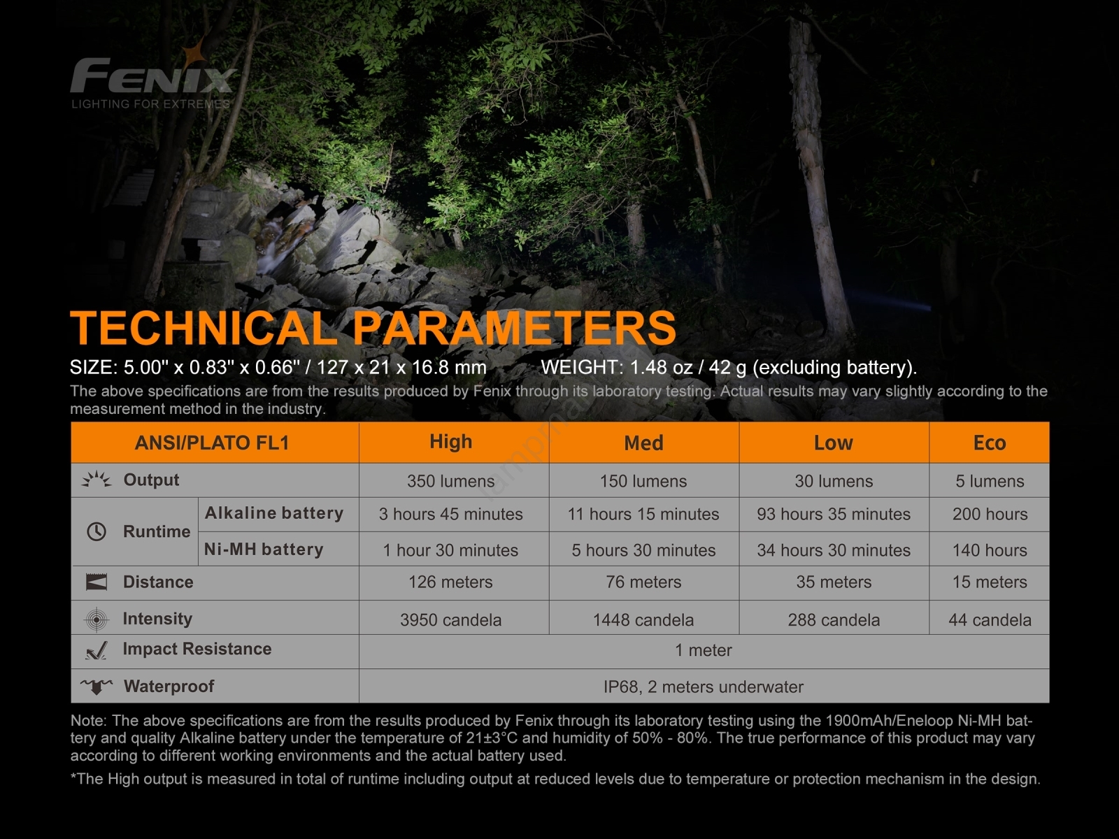 • Ficklampan är stöttålig vid fall från 1 meters höjd, dammtät och vattentät (nedsänkbar till 2 m).