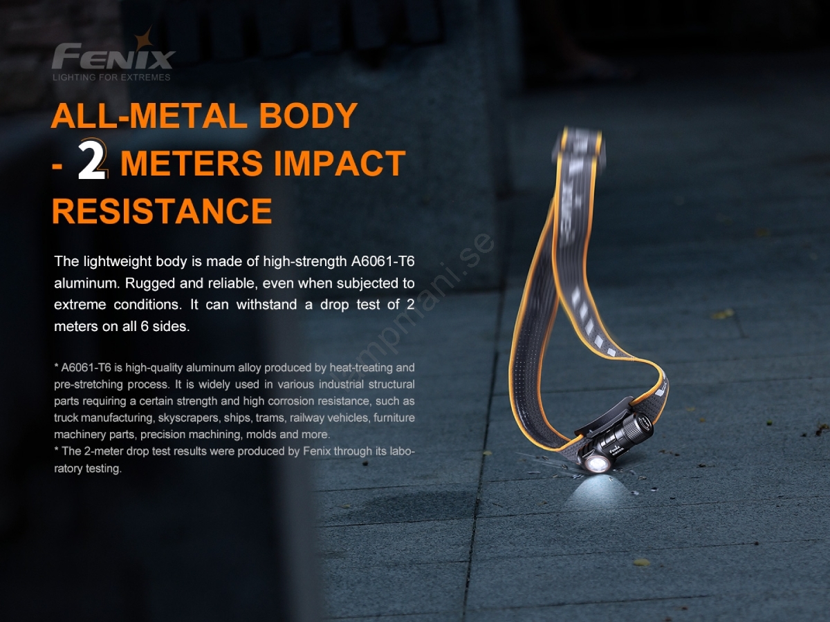 • Pannlampan är stöttålig vid fall från 2 meters höjd, dammtät och vattentät (nedsänkbar till 2 m).
