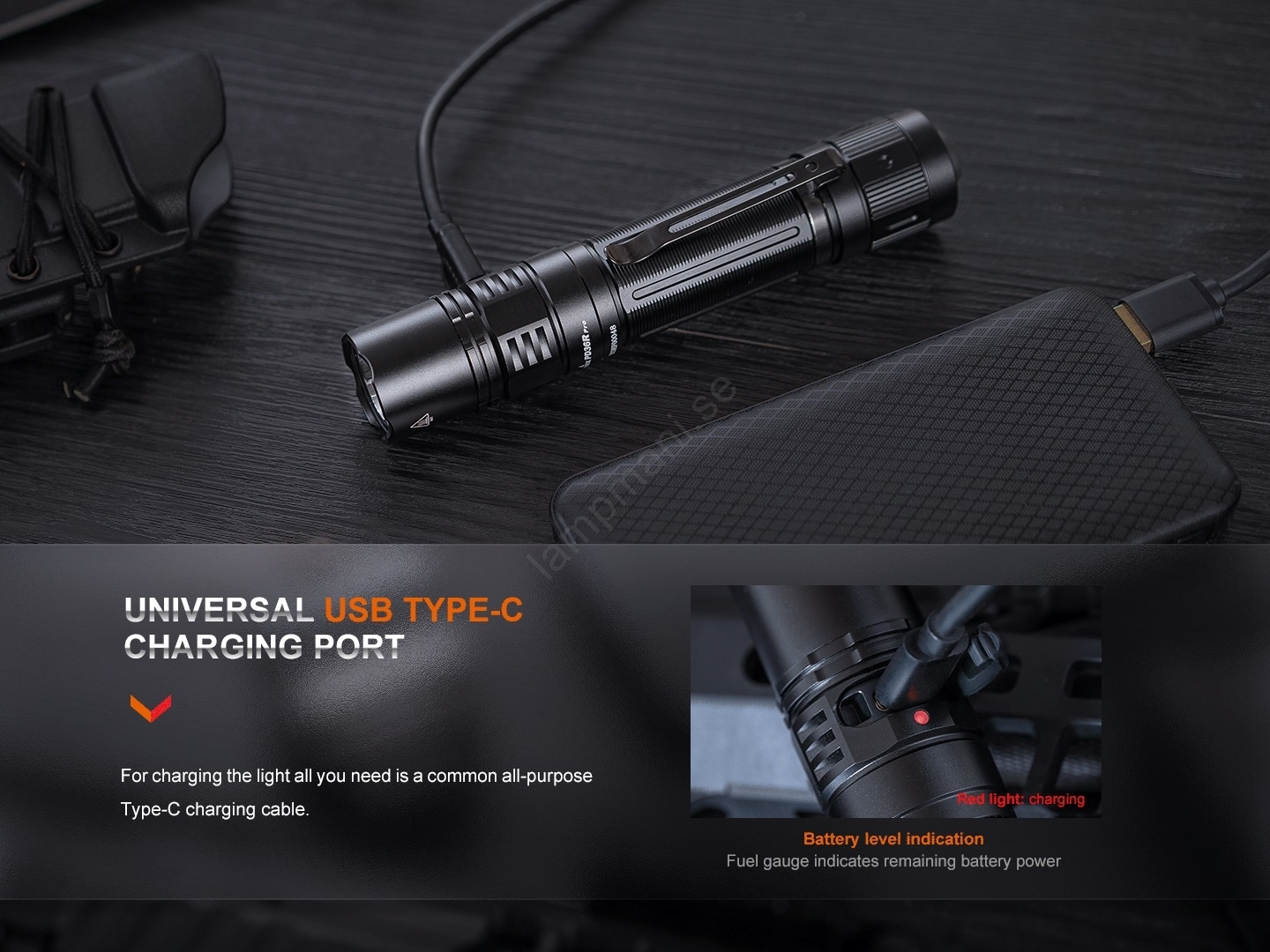 • Ficklampan levereras med batteri Fenix ARB-L21-5000, USB-C laddningskabel, handledsrem, bältesficka och reserv-o-ring.