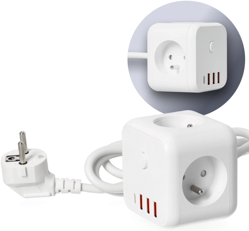 Förlängningskabel kub med strömbrytare LINEA 3x230V + 4xUSB A/C vit