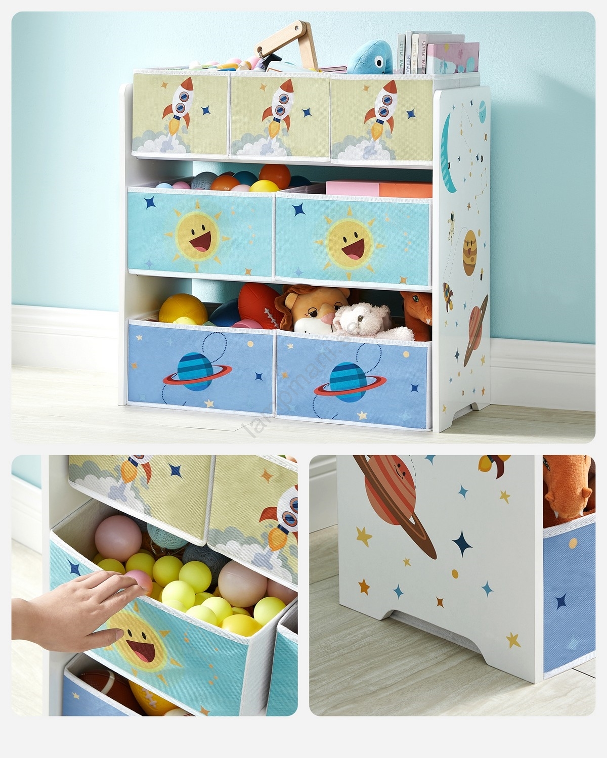 • Planeter och stjärnor lockar dina barn att förvara leksaker, böcker och alla andra saker i denna organiserare, vilket håller deras rum rent och prydligt.