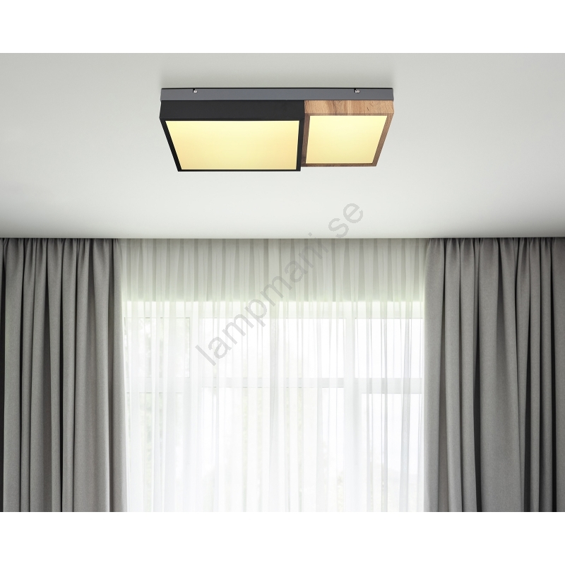 • Takarmaturen har en mattgrå metallbas, en matt svart metallram, MDF med trädekor och opalplast, vilket tillsammans ger ett modernt men ändå inbjudande intryck i inredningen.