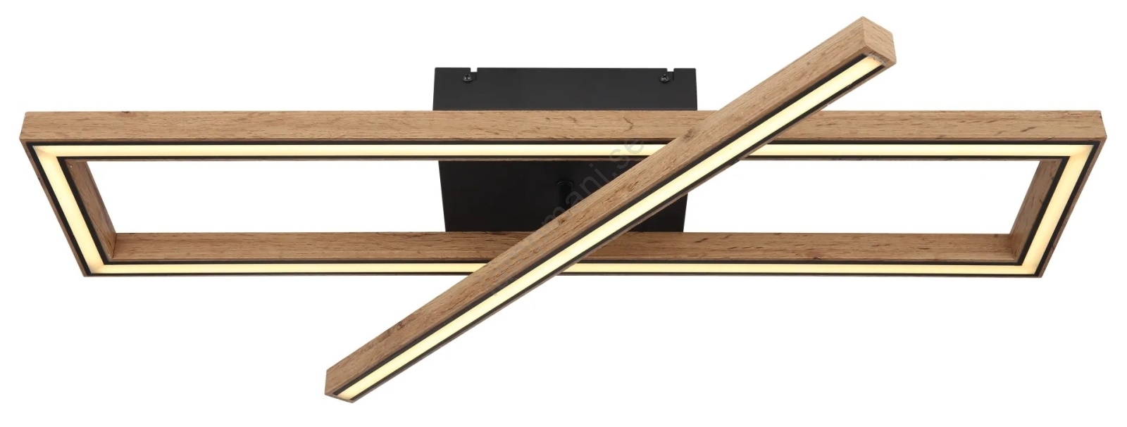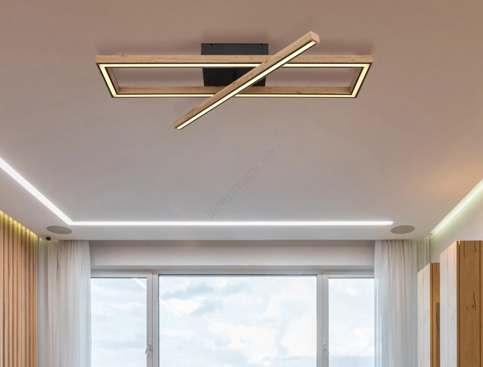 • Taklampan har en matt svart metallram, MDF med mörk trädekor och en opal plastskärm, vilket ger ett elegant och modernt uttryck.