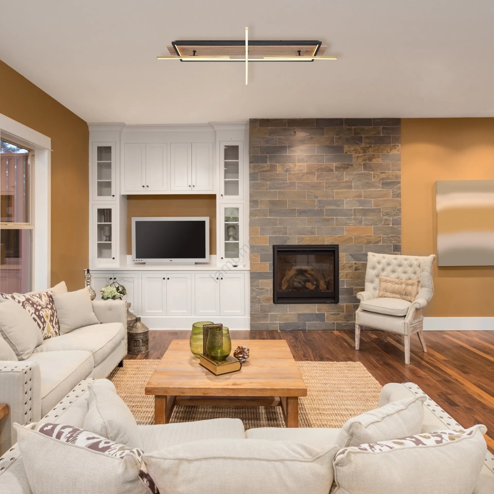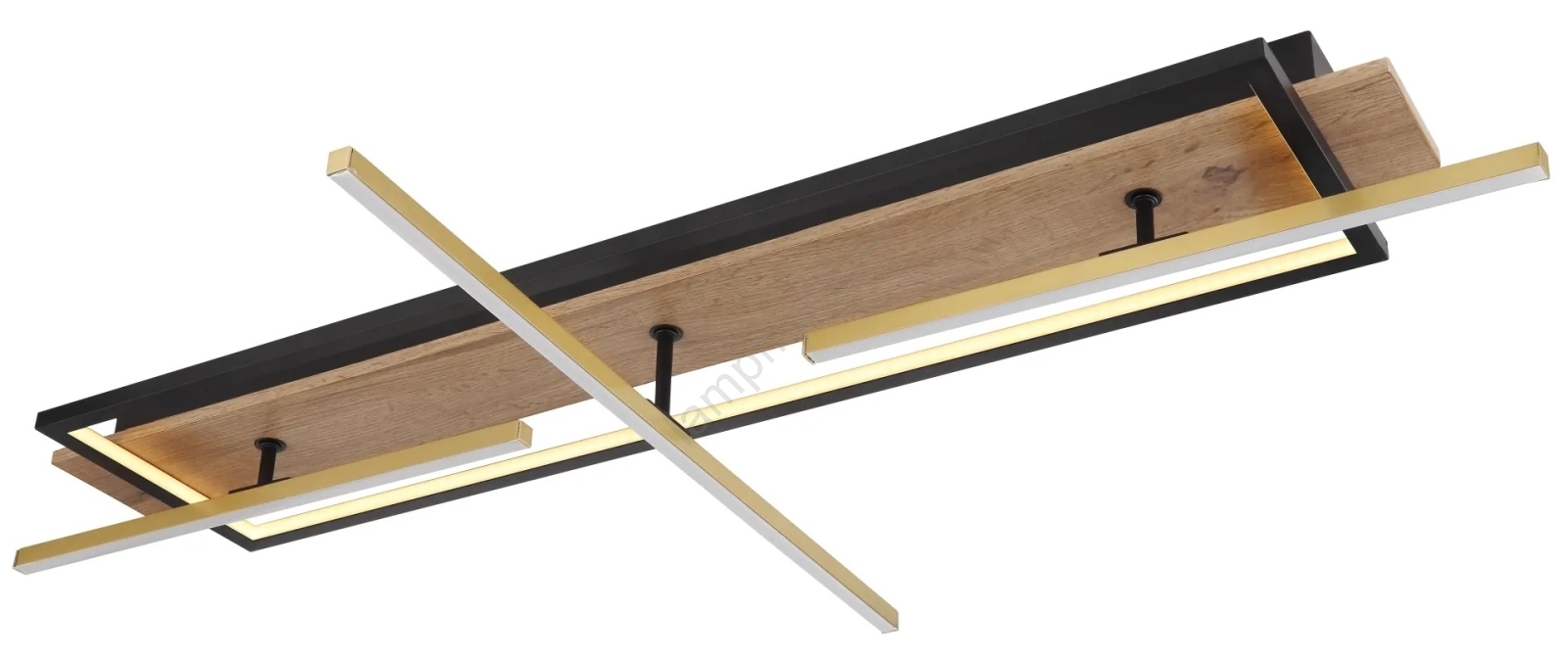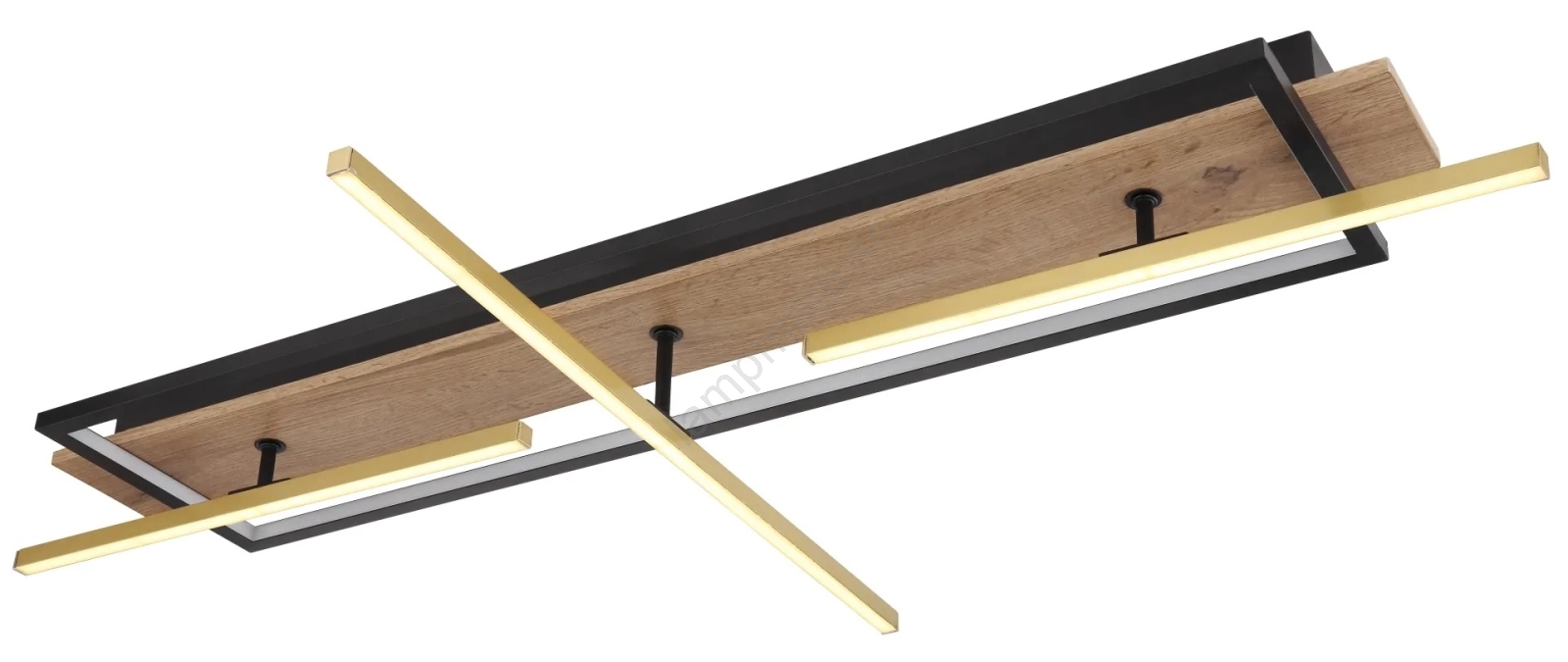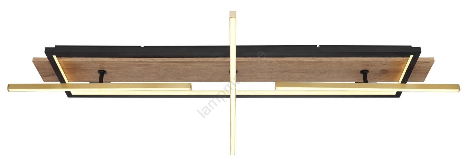 • Taklampan har ett svart matt metallhölje i kombination med mörka detaljer i träfiberskiva (MDF) och mässingsfärgade aluminiumstänger som ger rummet ett sofistikerat och modernt uttryck.