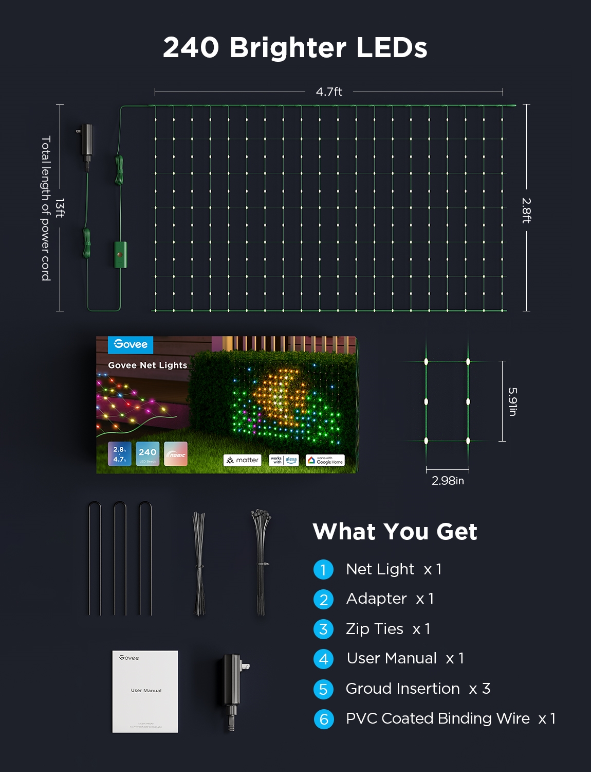 Govee - LED RGBIC ljusnät för utomhusbruk 143x85cm Wi-Fi Matter IP65 | Lampmani