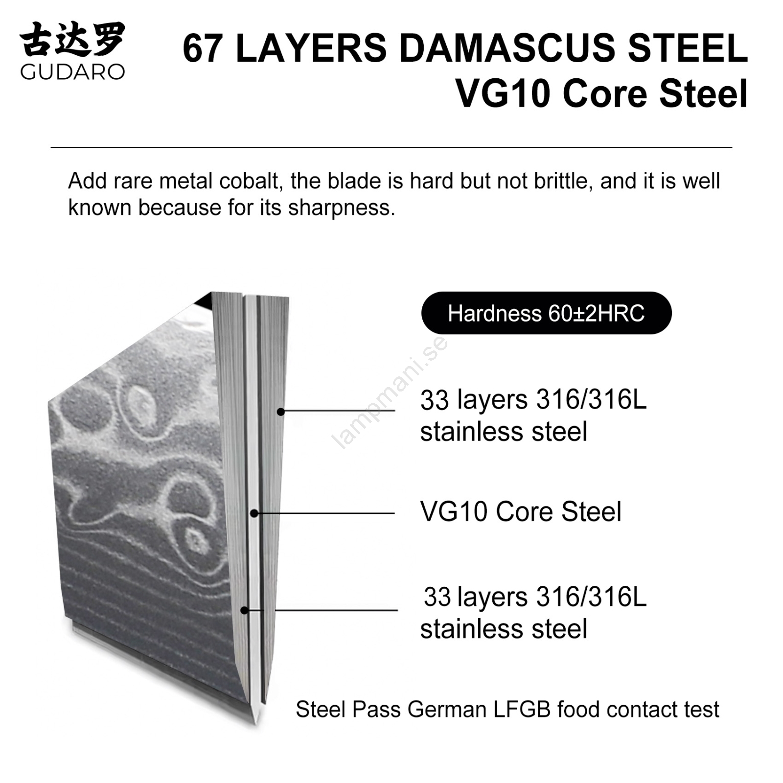 • Klingan består av 67 lager damaskusstål med en hård kärna av VG10 som ger extrem skärpa och långvarig eggstabilitet.