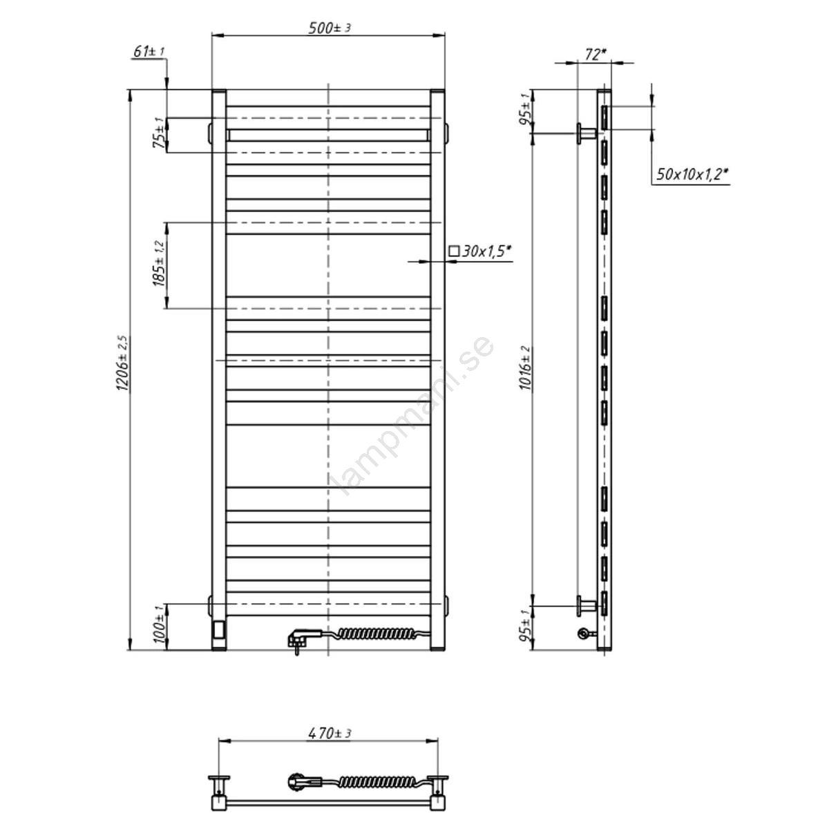 Handdukstork för badrum med termostat LARGO, 256 W, 120 x 50 cm, svart, högerutförande | Lampmani