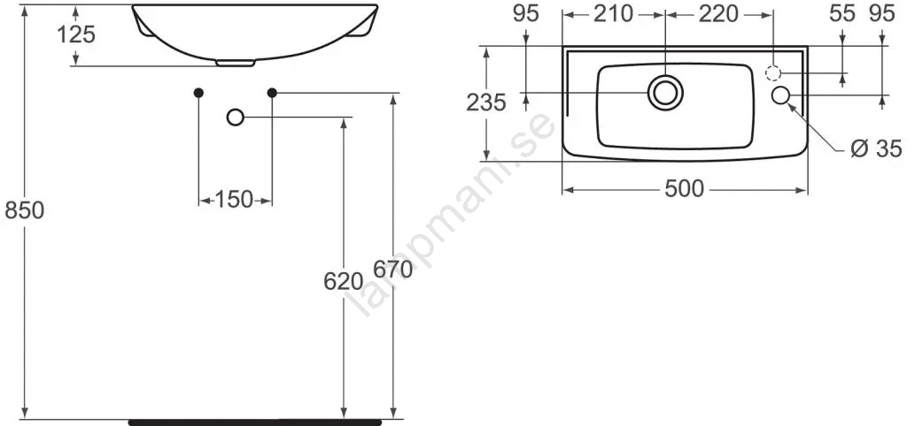 • Handfatet har ett förberett hål för montering av tvättställsblandare, placerat på höger sida.