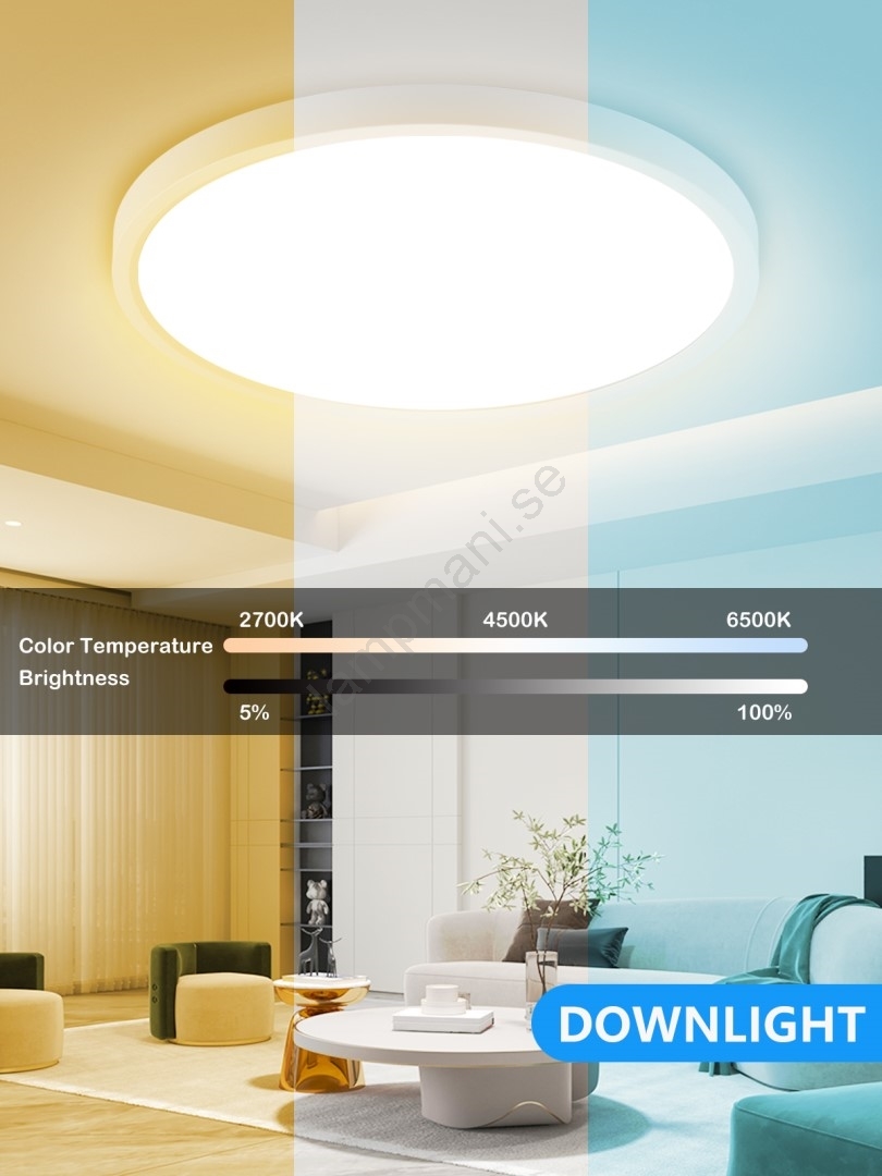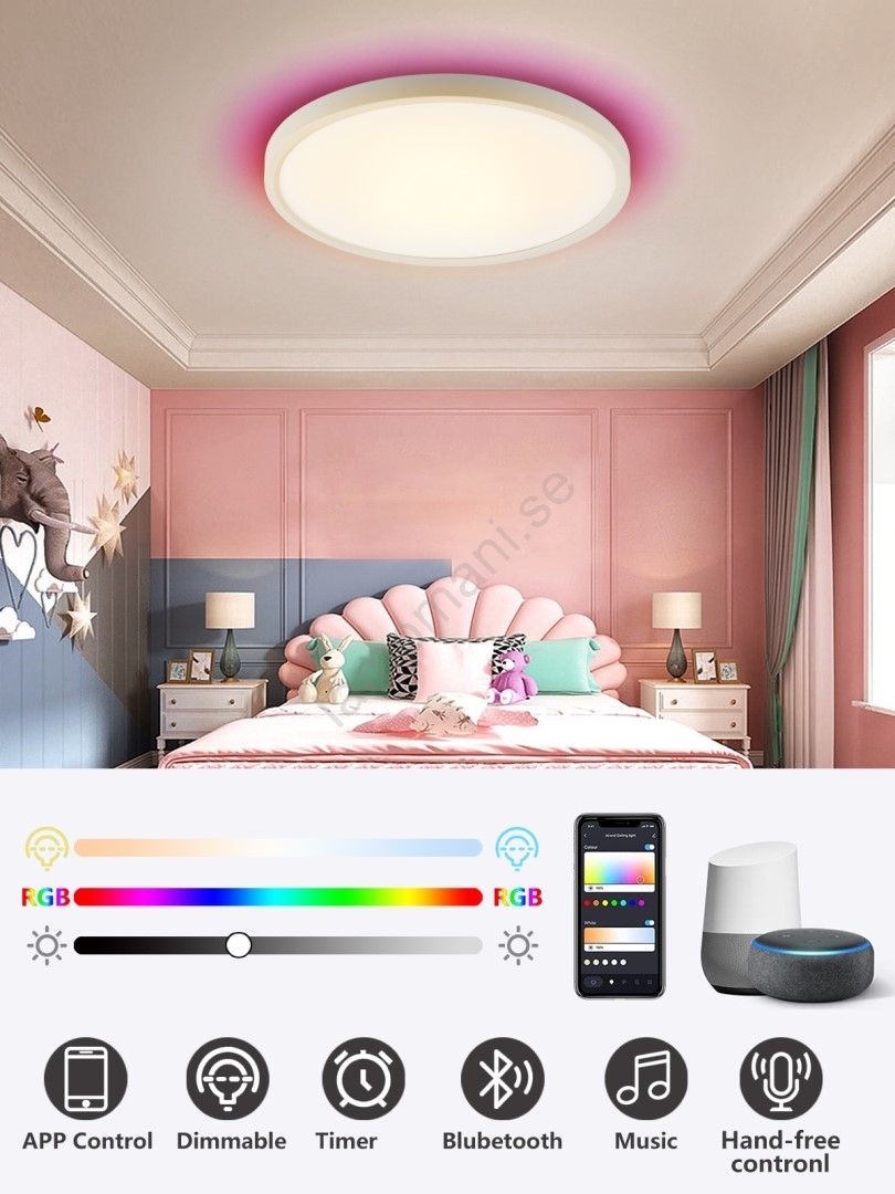 • Den kan dimmas och ljusfärgen kan ändras (2700-6500K) via telefon eller fjärrkontroll.