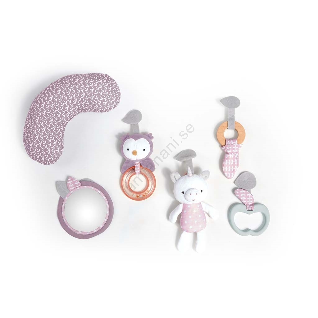 • Inkluderar 6 löstagbara leksaker: plysch enhörning, pärlspridd uggle-skallra, äpple av naturgummi, träring, säkerhetsspegel och magkudde.