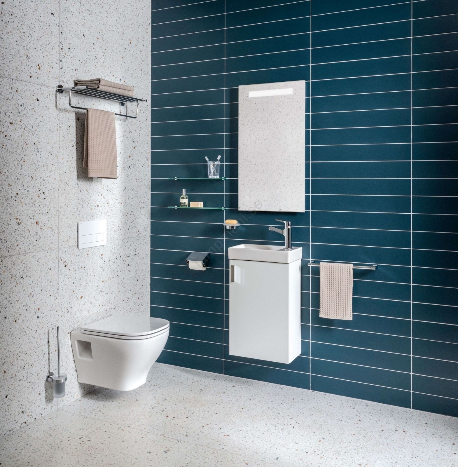 • Denna kombination är en praktisk lösning för att spara plats och erbjuder gott om förvaringsutrymme för grundläggande hygienartiklar.