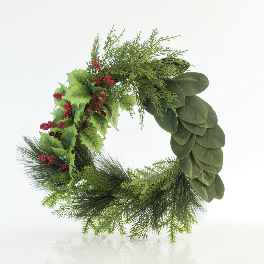 • Julkrans med konstgjord grönska och blad.