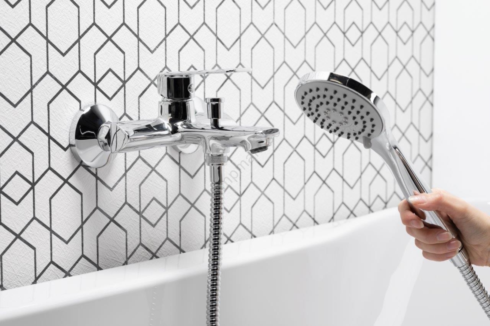 • Förpackningen innehåller: excenter (2 st), rosetter med tätning (2 st), 3-funktions handdusch, väggmonterad ledad hållare, duschslang.