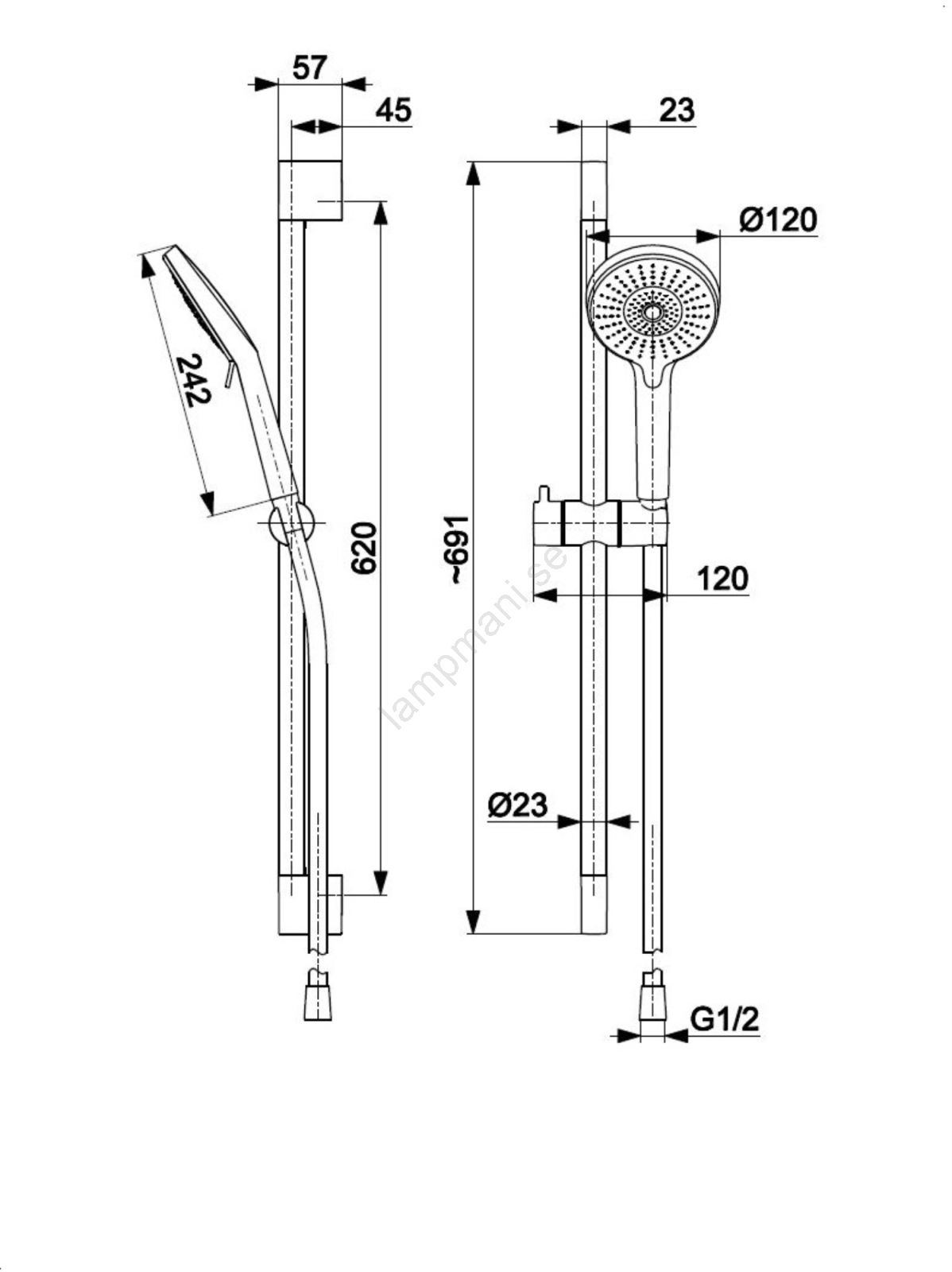 • Förpackningen innehåller: duschstång, väggfästen - 2 st (inklusive 1 fäste med möjlighet att anpassa positionen efter tidigare hål), monteringssats (2 skruvar med pluggar), handdusch med handtag, PVC-slang (L=1500 mm).