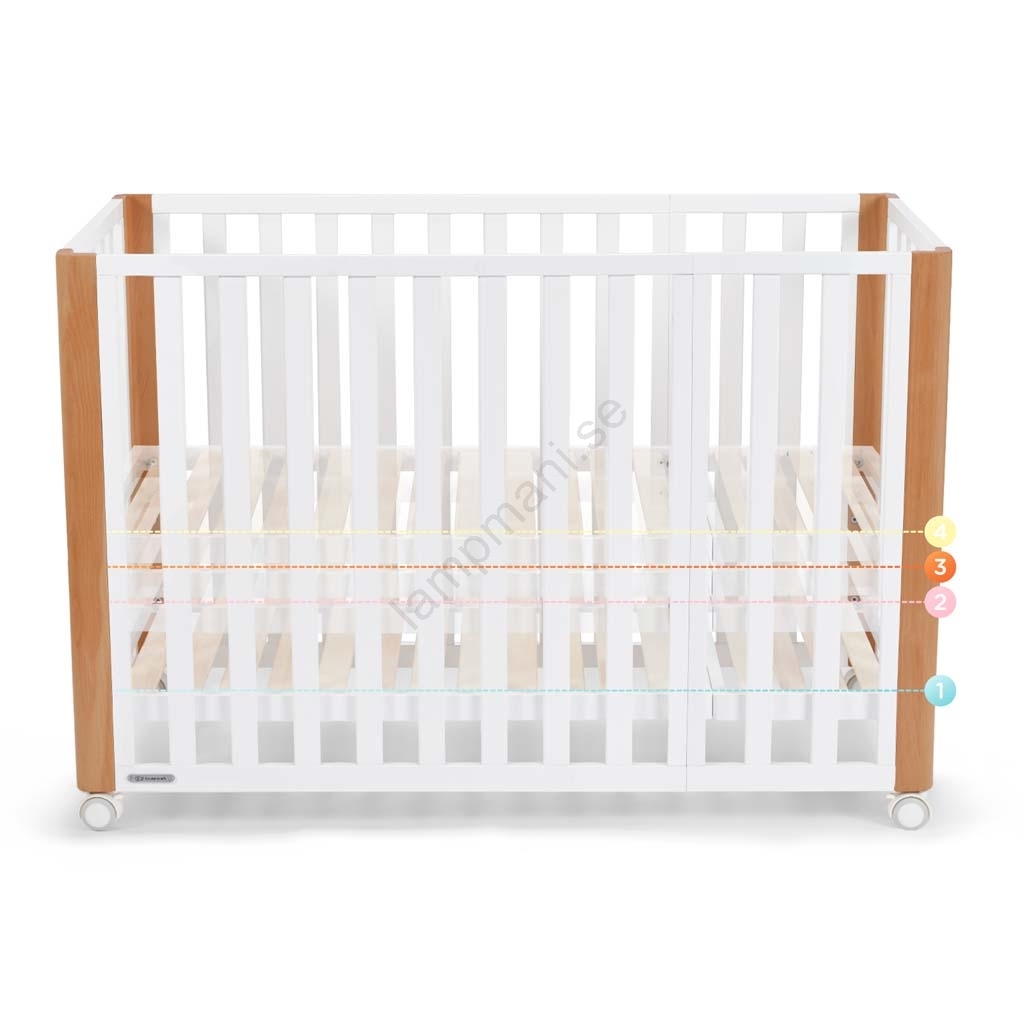 • Justerbar bottenhöjd: 3 nivåer i sidosängen och 4 i spjälsängen.