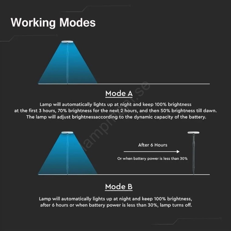 • Läge A - lampan tänds automatiskt efter skymning och lyser med 100 % ljusstyrka, efter 3 timmar sänks ljusstyrkan till 70 % och efter ytterligare 2 timmar till 50 %, vilket den behåller tills batteriet är helt urladdat eller tills gryningen.