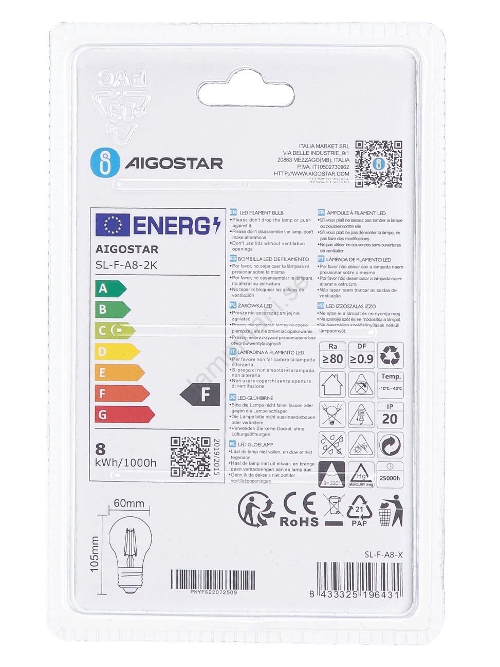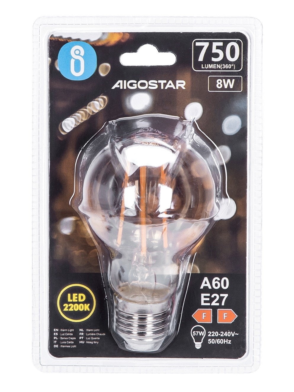 LED Glödlampa A60 E27/8W/230V 2200K - Aigostar | Lampmani
