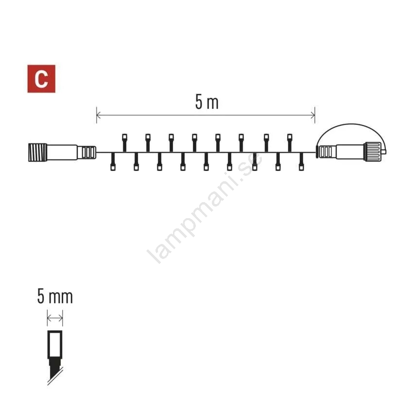 • Längd på den belysta kabeln: 5 m.