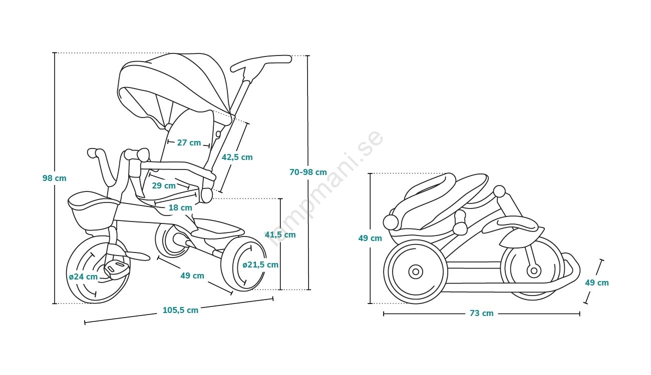 • Intuitiv montering (utan verktyg) gör att du snabbt kan fälla ihop trehjulingen och ge dig av.