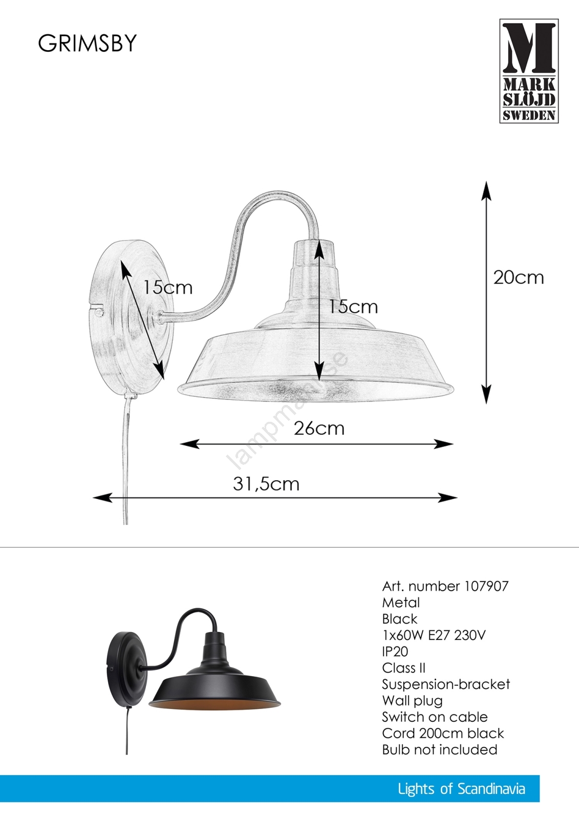 Markslöjd 107907 - Väggbelysning GRIMSBY 1xE27/60W/230V | Lampmani