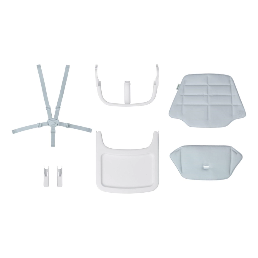 • Setet innehåller en vadderad dyna, säkerhetsbälten, ett matbord, ett handtag framför barnet samt förlängningar till stolens ben för ökad stabilitet.