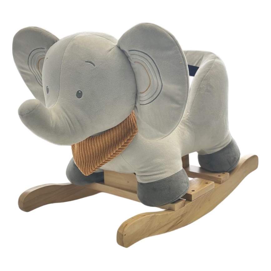 • Vacker plyschgunga i form av en elefant med träbas och handtag, en leksak som lockar till både gungning och klappning.