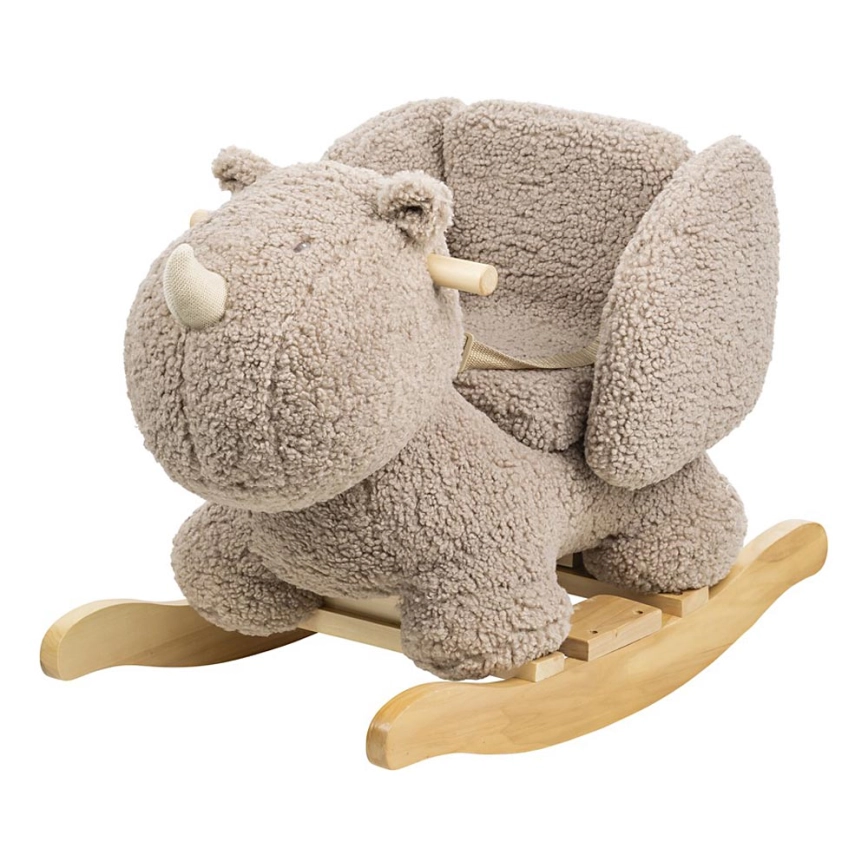 • Vacker plyschgungande noshörning med träbas och handtag är en leksak som lockar till både gungning och klappning.