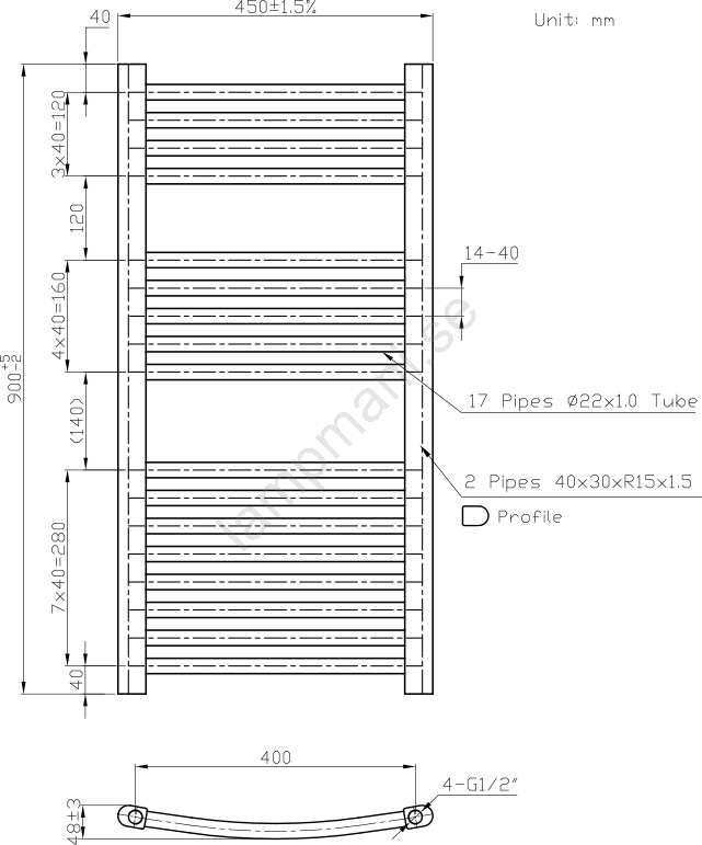 • Rundad radiator med anslutning för 4 anslutningsöppningar, vridbar.