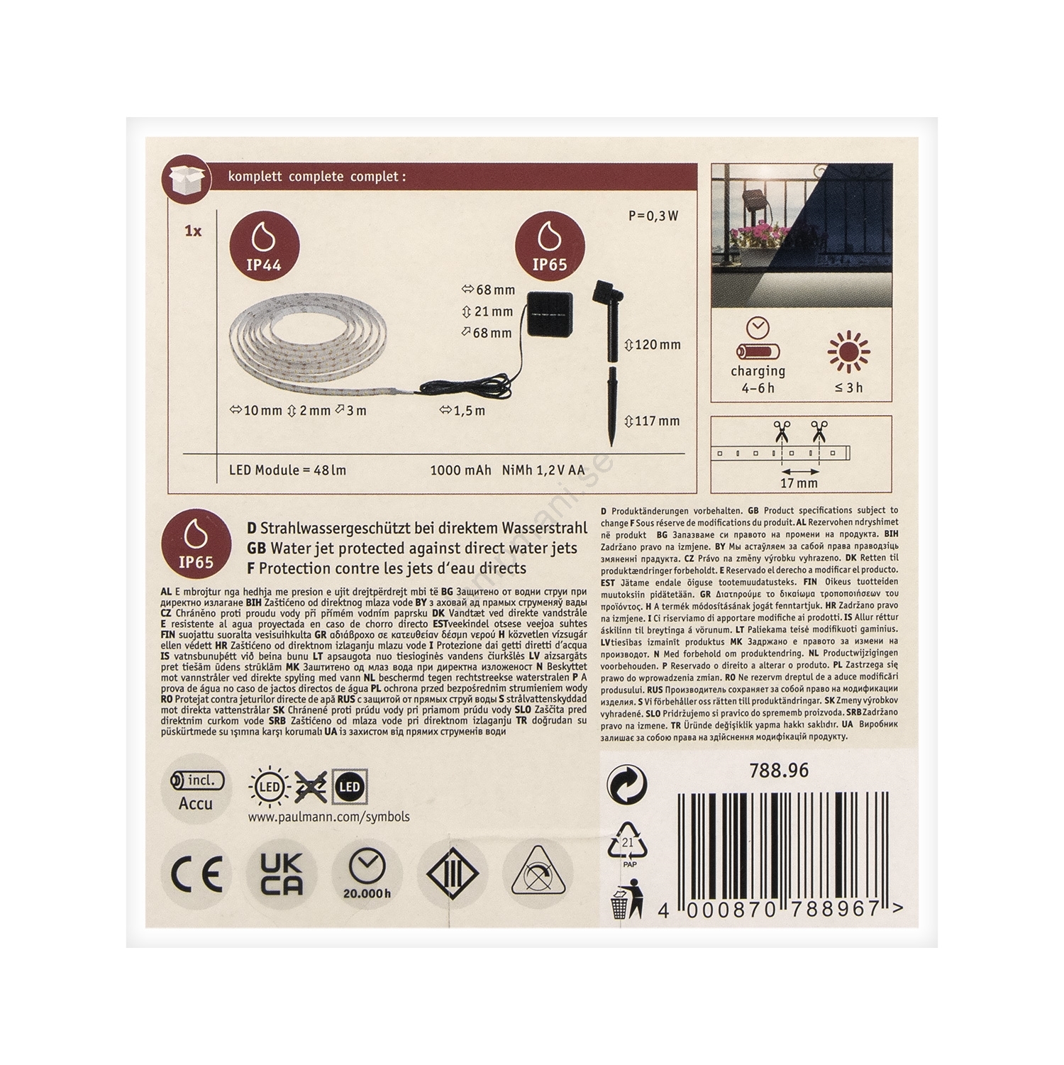 Paulmann 78896 - LED/0,3W IP44 Solarbelysning 3m 1,2V 1000 mAh