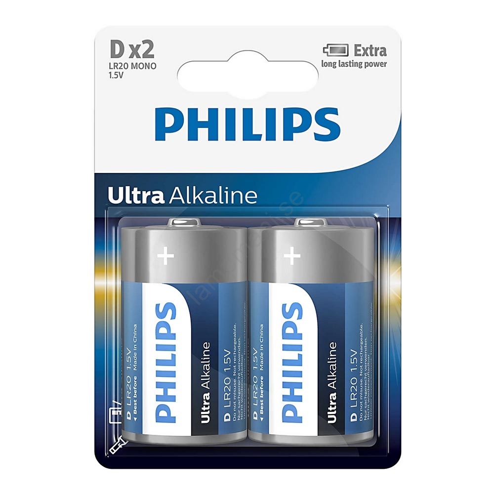 Philips LR20E2B/10 - 2 st Alkaliska batterier D ULTRA ALKALINE 1,5V 15000mAh | Lampmani